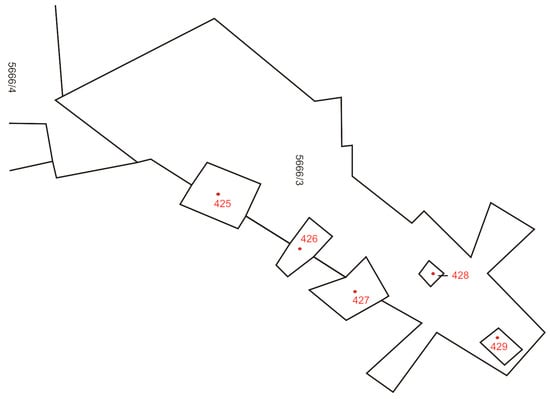 2D visualization of the boundaries of underground construction for the archeological park in Pavlov. Every component of the construction located above ground has to exist on a separate building parcel (here, a total of five building parcels with bold red numbers are shown, after []).