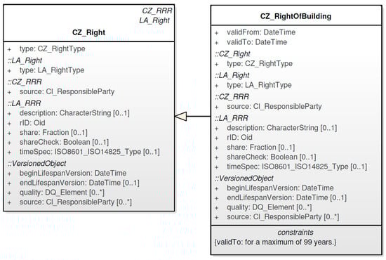 The class CZ_RRR consists of the subclasses CZ_Right and CZ_Restriction. As depicted in Figure 4, the class CZ_Right has a single subclass, CZ_RightOfBuilding. Based on this new instrument within Czech law, it will be possible to construct a building on land belonging to a third party. The right of building is a temporary right (with a 99 year maximum) established by an agreement between the land owner and the developer. From a legal point of view, the right of building as a whole is considered to be real estate and is subject to registration within the cadastre of real estate. The right of building can be subject to a transfer, mortgage, heritage or easement and is independent of the existence of the structure and can therefore be established even if the construction procedure has not yet begun. After expiry of the right of building, it can be theoretically prolonged, otherwise the building becomes a part of the land. The mandatory attribute validTo (of the class CZ_RightOfBuilding) is used for storing this information until the right of building is valid.