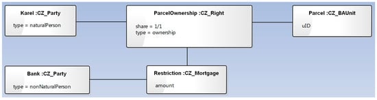 The class CZ_Restriction has a single subclass, CZ_Mortgage. The Czech cadastre was open to the public from the very beginning. This principle of openness proved to be very useful after mortgages were introduced in the cadastre. Figure 5 shows the principle of mortgage (modeled as CZ_Mortgage). Against the LA_Mortgage class, the attribute type (of the class CZ_Mortgage) is mandatory.