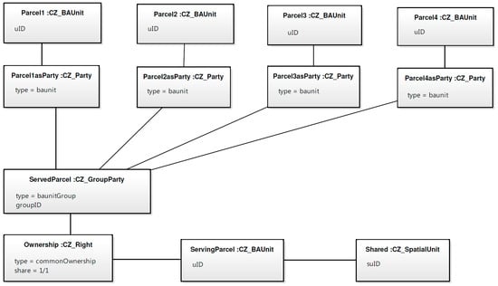 Regarding the relationship between the classes CZ_BAUnit and CZ_SpatialUnit, one instance of CZ_BAUnit (with the same RRRs attached) is associated with exactly one instance of CZ_SpatialUnit. CZ_BAUnit can also represent a party (where baunit represents a party). This approach is employed to model the supplementary co-ownership, which is a special type of ownership in that owners of their own property are allowed to utilize that property only in association with some shared property. The ownership of this shared property is known as supplementary co-ownership (according to the new Civil Code). Ownership of property as supplementary co-ownership is inextricably linked with the ownership of properties for whose use the property with supplementary co-ownership serves. The separate transfer of such property is not possible. One example includes a serving parcel as demonstrated in Figure 6, wherein the serving parcel provides access to neighboring parcels, and the serving parcel is not public, but is instead commonly owned by the neighboring parcels (modeled as baunit as party).