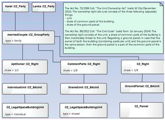 The ownership of a building unit is one of the most common situations within the cadastre. Figure 7 illustrates the principle of owning a building unit. The new Civil Code also regulates the ownership of building units, which was previously contained under a separate act (the Unit Ownership Act). To model the ownership of a building unit, the CZ_LegalSpaceBuildingUnit class was proposed, which is a subclass of the LA_LegalSpaceBuildingUnit class. A building unit, as defined by the former Unit Ownership Act, remains a separate piece of real estate and does not constitute a part of the land even in the case wherein the owner of the building unit and the owner of the land parcel is the same person. The former Unit Ownership Act and the new Civil Code provide a different view on the subject of the right of ownership to that building unit. According to the Unit Ownership Act, the right of ownership (de iure) consists of the following three separate components: a unit, a share of common parts of the building and a share of the land parcel. The new Civil Code considers the ownership of the unit and the share of common parts of the building as one inextricably linked element. Regarding the land parcel (from the new Civil Code point of view), in the case that the owner of both the building (containing the unit) and the land parcel is the same person, the land parcel then constitutes a part of the common parts of the building. The size of the share is determined by the size of the building unit in relation to the total area of all of the units. However, this is not the only method with which to compute the size of the share. The new Civil Code also makes it possible to consider, for example, the height of the ceiling. The greater the height of the ceiling, the more space that the owner would own, and thus, the share would be greater.
