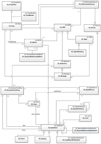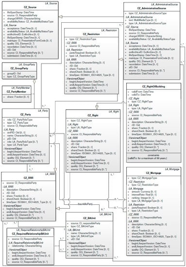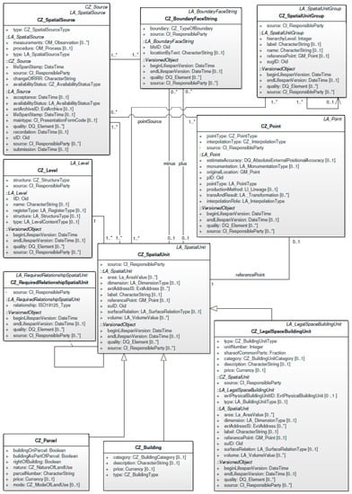 Another Level 3 class contained within the Czech LADM-based profile is CZ_RequiredRelationshipBAUnit (a subclass of LA_RequiredRelationshipBAUnit). This class serves to model relationships (of a legal, temporal or spatial nature) between instances of LA_BAUnit. For example, only one building can be constructed on a parcel; however, that building can be built on one or many parcels. The next Level 3 class included in the Czech LADM-based profile is the LA_LegalSpaceBuildingUnit class, which serves to model building units. The remaining LADM Level 3 classes are not contained within the Czech LADM-based profile, e.g., the LADM class LA_Responsibility. Currently, there are no responsibilities registered, and therefore, these responsibilities are not included in the proposed country profile.