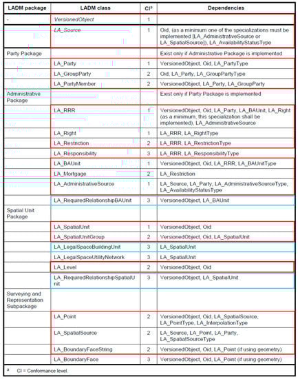 The LADM consists of three packages and one sub-package, each of which are specified with a conformance test in Annex A—Abstract Test Suite []. The following three conformance levels are specified per (sub)package: Level 1 (low level), Level 2 (medium level) and Level 3 (high level). Level 1 tests include the most basic classes per package, and Level 2 further includes the more common classes. Level 3 includes all of the classes. Any LADM-based profile claiming conformance to the ISO 19152 standard must satisfy the requirements of Annex A.