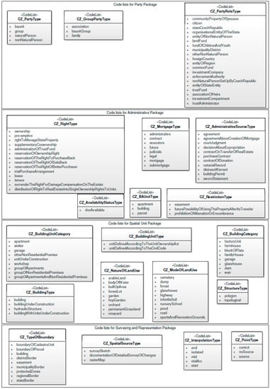 The code lists used in the Czech LADM-based country profile. In some cases, the presented code list contains only a subset of all of the possible values. For example, in reality, the LA_RightType code list contains more than 160 types of different types of right.