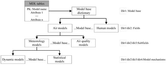 A large and diverse set of geographic models have been developed in recent years across multiple geographical fields that use various model mechanisms, including agent-based models, dynamic models, statistical models, and so on. When investigating a geographic problem, we first decompose the problem into relevant subfields and search for models that can solve these sub-problems well; then, we consider the model mechanism or its implementation. To assist researchers in searching for and managing models efficiently from a model base, based on the analysis above, a model base dictionary is one possible method for organizing the models. Supported by MDL, one instance of a model base dictionary is shown in Figure 2.