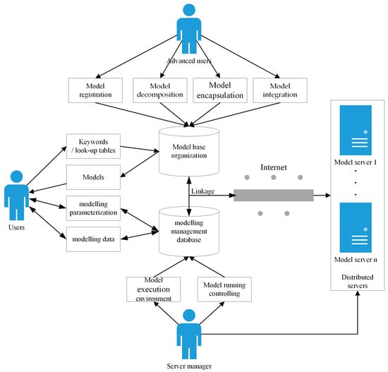 The terms model library [], the Network for Computational Modelling in the Social and Ecological Sciences (CoMSES Net) Computational Model Library (CML) [], and model bank [] are treated as having the same meaning in this study and are referred to as “model base,” which is an organizational collection of models contained in an electronic storage medium accessible to users and programs []. The models in the model base are expected to be reused as building blocks for more complex systems, provided that they can be linked together in a meaningful way (matching the variables, scales, etc.) []. As a valuable supplementation of the archived models in a model base, which is intended for sharing source code, documentation, and so on, managing the organizational models in a model base involves a wide variety of functions. These may include model creation and editing, querying and updating models, executing models, and generating reports so that others can replicate a set of modelling procedures [,,]. The term model management was coined in the early-to-mid-seventies in the context of managing models for a decision support system, aiding in the creation, storage, retrieval, manipulation, and utilization of models for decision-makers, so they could make better use of the models [,,]. These functions are analogous to those of a database management system, where the objects of interest are data records instead of models. Thus, a model base management system (MBMS) should be able to store and manipulate models in ways similar to the methods database management systems (DBMS) store and manipulate data []. Therefore, it is not surprising to see the strong influence of database technology in the creation of model management systems [,].