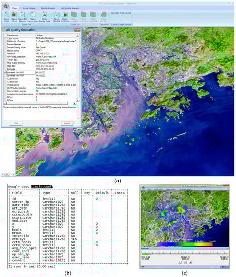 Application of a VGE prototype for air quality simulation. (a) Graphical User Interface (GUI) for model selection and model setting; (b) Modelling parameters managed in MySQL database; (c) Visualization of simulated air quality process in the VGE.