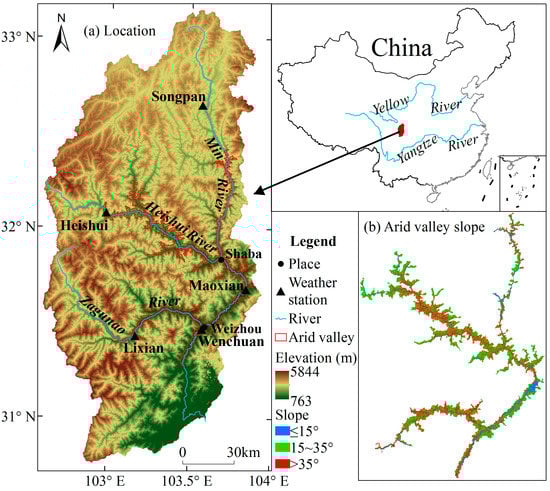 Geographical location of the arid valley in the upper reaches of the Min River: (a) location of the arid valley; and (b) arid valley slope.