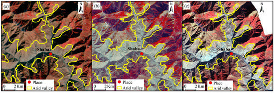 The arid valley boundaries in different periods near Shaba: (a) the arid valley in 1974 that was interpreted from Landsat MSS images; (b) the arid valley in 1999 that was interpreted from SPOT-2 and SPOT-4 images; and (c) the arid valley in 2013 that was interpreted from SPOT-6 images.