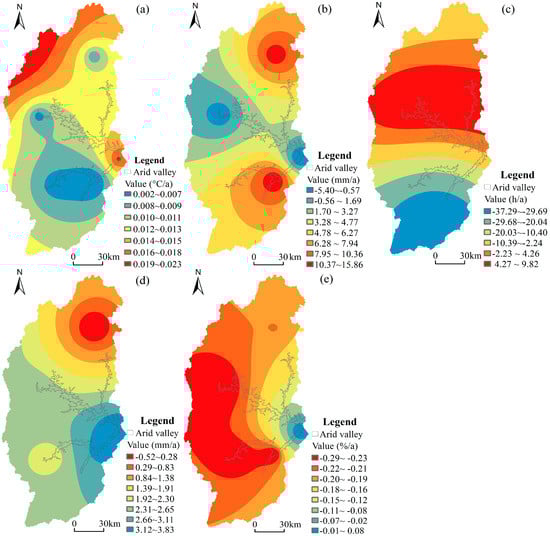 Spatial distributions of inter-annual variations of meteorological elements during 1999–2013 in the upper reaches of the Min River: (a) annual average temperature variation; (b) annual evaporation variation; (c) annual sunshine duration variation; (d) annual precipitation variation; and (e) annual average relative humidity variation.