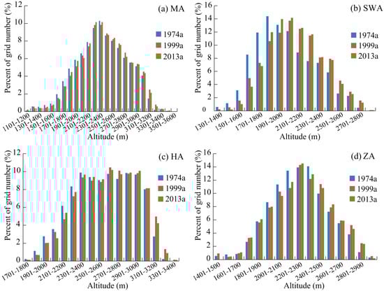 Vertical distribution of the arid valley boundary during 1974–2013: (a) MA: the upper reaches of the Min River; (b) SWA: the Shaba-Weizhou mainstream of the Min River; (c) HA: the Heishui River Basin; and (d) ZA: the Zagunao River Basin.