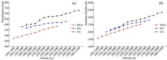 Climate characteristics of the arid valley boundaries in different altitudes in regions: (a) vertical distribution of precipitation; and (b) vertical distribution of sunshine duration.