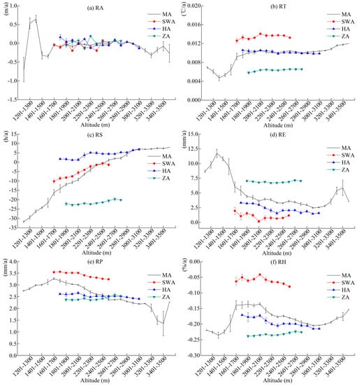 Vertical distributions of the arid valley boundaries’ displacements and meteorological elements’ variation rates in the upper reaches of the Min River during 1999–2013: (a) RA: variation rate of average altitude of the arid valley boundary; (b) RT: variation rate of annual average temperature; (c) RS: variation rate of annual sunshine duration; (d) RE: variation rate of annual evaporation; (e) RP: variation rate of annual precipitation; and (f) RH: variation rate of annual average relative humidity.