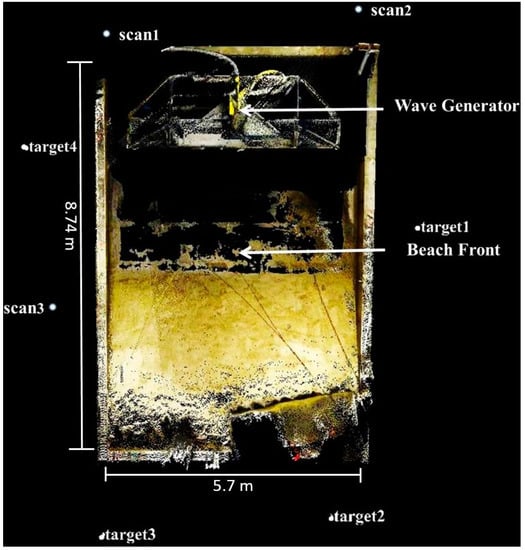 The terrestrial LiDAR system scanned the beach with a 0.002° resolution and a scanning range of 500 m (the minimum scanning distance with a setting of 300 kHz laser pulse repetition rate and 122,000 measurements/second). To capture the entire beach, this experiment conducted multi-site scans at two locations near the end of the wave tank for each survey and added a third location at the side of the beach during the last survey to capture a deeply eroded area that might have been blocked from the other two locations. Four highly reflective cylindrical targets provided by the LiDAR system were evenly distributed around the tank (Figure 1) before and after each 10-min wave application to ensure consistent registration from multi-site and multi-temporal scanning. The LiDAR operation system RiSCAN PRO software used a multi-site registration function and the four targets to accurately register all data from 17 panorama scans through one time of registration process. As a result, a total of four topographic models acquired under no water condition were used in the following beach analysis. Noises from images of nearby walls, frames and beaches reflected by the residual water and with elevations below the wave tank floor were manually removed during the preprocessing stage.