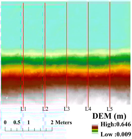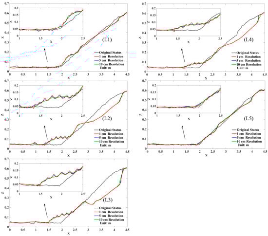 Using beach models with 1, 5 and 10 cm resolutions, the impact of resolution on beach profile analysis can be examined in Figure 8. Profiles L1 and L5 lie close to the left and right edges of the wave tank, where relatively slight sediment changes occurred comparing to L2 to L4. Side effects can be observed further towards the wall through Figure 3d due to border effects. More distinguishable patterns were obtained at profiles L2, L3 and L4. Areas with relatively smooth surfaces resulted in less differences among profiles with different resolutions as demonstrated in the distance from around 2.5 to 4.2 m in L2, L3, and L4. However, those topographic features with peaks and troughs, smaller width, or abrupt slope changes could only be identified and accurately measured from the profiles derived from higher resolution models as shown in the areas with ripples (1.4–2.5 m) in L2, L3, and L4 and around 4.3 m in L4 and 3.9 m in L5.