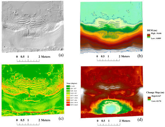 (a) Hill-shaded relief map, (b) contour map (5 cm intervals) overlaid on DEM, (c) slope map and (d) map of elevation change.