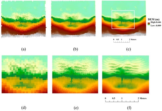 Beach morphological models having resolutions of 10 cm (a), 5 cm (b) and 1 cm (c) with corresponding highlighted areas of erosion and deposition (d), (e), and (f) showing clarity of the area with the most sediment dynamics.