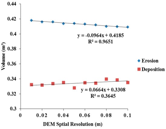 The changes in beach volume between the initial and final beach models of the entire study site were calculated. Pixels with negative values were classified as erosional areas while pixels with positive values were classified as depositional areas. Depositional volume, erosional volume, and net change were extracted from models with resolutions ranging at 1 cm increments from 1 cm to 10 cm. Figure 5 summarizes the relationship between spatial resolutions and derived erosional and depositional areas. As the spatial resolution changed from 1 cm to 10 cm, erosional volume decreased from 0.41799 m3 to 0.40925 m3 with a total underestimation of 2%. There is a strong linear regression of y = −0.0964x + 0.4185 with an R2 of 0.9651. With the increase of cell size, depositional volume increased from 0.32815 m3 to 0.33986 m3 with a total overestimation of 3.5%. There is a linear regression of y = 0.0664x + 0.3308 with an R2 of 0.3645. Overall, the results indicated that interpolating morphological models with coarser resolutions leads to underestimations of erosional volume and overestimation of depositional volume.