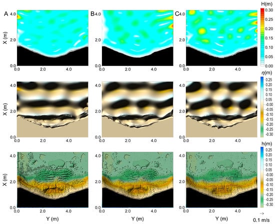 The wave modeling results derived based on 1 cm (A), 5 cm (B) and 10 cm (C) beach models. From top to bottom row are the wave height, instantaneous free surface, and currents, respectively.