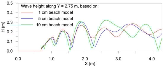 The wave height profile along Y = 2.75 m for the modeling results based on beach models with 1, 5, and 10 cm resolutions.