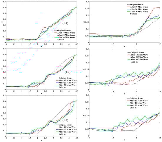 Beach evolution analysis based on beach profiles L1 through L3 (left column), with L3 in the middle of the wave tank. The column on the right includes the plots of corresponding areas (1–2.5 m) with subtle differences.