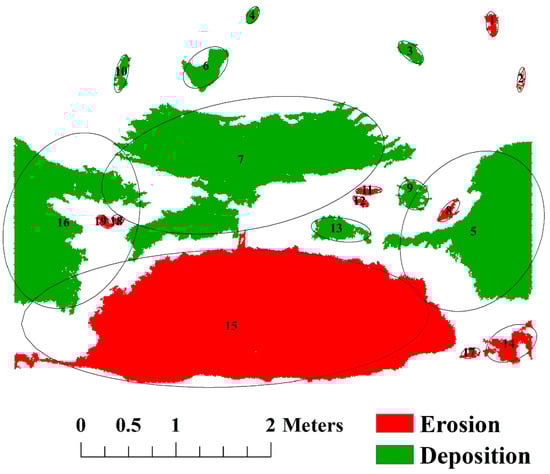 Based on the elevation change map with 1 cm resolution in Figure 3, CMA identified a total of nineteen objects (ten erosional and nine depositional) outlined by fitted ellipses illustrated in Figure 10 with a focus on significantly changed areas over 2 cm in elevation and over a minimum of 50 pixels. Attributes of each object including location, area, volume, and object type are listed in Table 1, which is organized by object type and volume. The location of each object was represented by the center coordinate of the corresponding fitted ellipse. Table 2 and Table 3 summarize the statistics of sum, minimum, maximum and standard deviation of area and volume for the identified objects. The total erosional and depositional areas were 4.5525 m2 and 4.8904 m2, respectively. The erosional objects have a minimum area of 0.0063 m2 and a maximum area of 4.3522 m2; while depositional objects have a minimum area of 0.2 m2 and maximal area of 0.0173 m2. The standard deviation of erosional objects (1.3695 m2) is approximately twice as that of the depositional area (0.7861 m2), indicating that the size of erosional objects varies more than the size of depositional objects. Meanwhile, the total erosional and depositional volumes are 0.398341 m3 and 0.232801 m3, respectively, ranging from minimum volumes of 0.000137 m3 and 0.000429 m3 to maximum volumes of 0.393447 m3 and 0.09923 m3. Erosional objects also vary more than depositional objects in terms of the volume due to a larger standard deviation. The average thickness of objects was calculated as total volume divided by total object area. For this experiment, the average thickness of erosional and depositional objects was 0.087 m and 0.048 m, respectively. Thus, the average thickness of erosional objects was almost twice that of depositional objects. These object-oriented statistics and geometry are demonstration of potential information that can be used for beach nourishment.