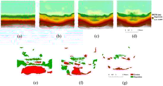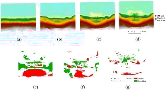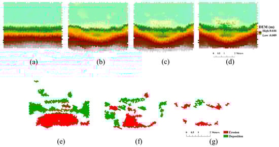 Beach evolution based on CMA analysis and beach models with 1 cm resolution. The upper figures are beach models showing the initial model (a) and models after one (b), two (c), and three (d) periods of wave application. (e,f) show the changing areas of sediment erosion and deposition between consecutive beach models that occurred after one (e), two (f), and three (g) periods of wave application. Each period of wave application lasted 10 min.