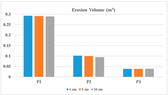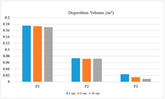 The results in Figure 11, Figure 12, Figure 13, Figure 14 and Figure 15 demonstrate the beach evolution based on CMA and beach models with 1, 5, and 10 cm resolutions. Figure 11, Figure 12 and Figure 13 showed that majority of the erosion and deposition were formed after the first period of wave application (P1). During the following periods of wave application, P2 and P3, drastically reduced areas and volumes of sand were eroded and deposited, but more ripple patterns were formed at the beach front. Overall, the beach was moving towards an equilibrium profile for the forcing conditions. When decreasing resolutions from 1 to 10 cm, the impacts of resolution were obvious from area statistics, reduced number of objects, and fuzzy boundaries. For 3D volume assessment, Figure 14 and Figure 15 demonstrate that the impacts on CMA-derived deposition volumes are minor when deposition areas are dominated by large areas. However, when the depositional objects are fragmented (such as P3), the impact of resolutions are significant (P2 is 62.1% of P1 and P3 is 39.7% of P1). This unexpected change is likely due to two factors: the minimum number of pixels for objects and ignoring insignificantly changed areas of less than 2 cm vertical difference.