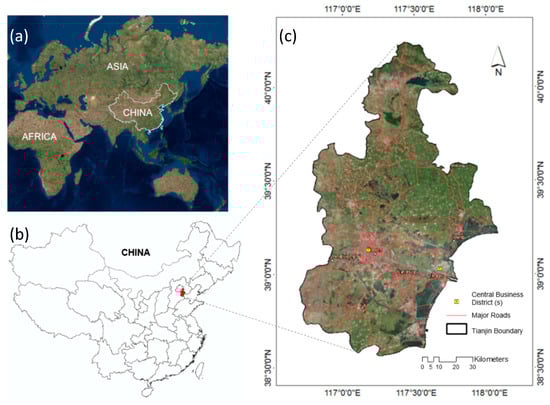 Location of the study area: (a) location of China in the world; (b) location of Tianjin city in China; (c) Tianjin area. Source: Esri, DigitalGlobe, Geoeye, Earthstar Geographics, CNES/Airbus DS, USDA, USGS, AEX, Getmapping, Aerogrid, IGN, INP, swisstopo, and the GIS User Community.