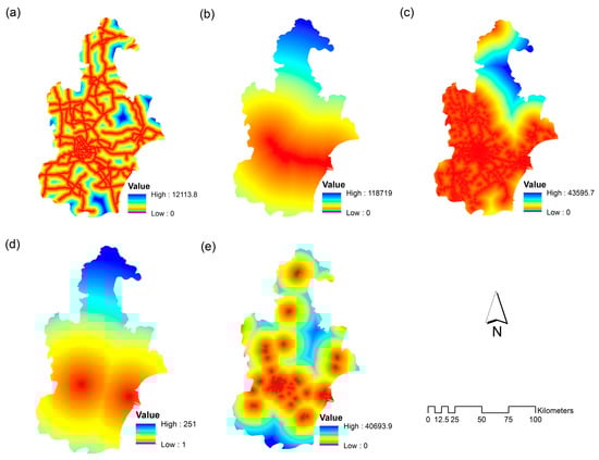 Spatial patterns of five variables: (a) distance to roads; (b) distance to subways; (c) distance to the capital bus stations; (d) distance to CBDs; (e) distance to markets.
