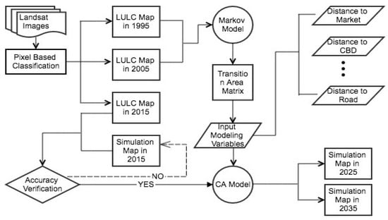 This section presents the modeling process of future LULC with the interactions of modeling variables. The process of simulation that was followed in urbanization modeling is shown in Figure 3. First, we used Landsat images to perform pixel-based classification in ArcGIS software; this was compared with the Google images to make sure that accuracy was acceptable. After that, we input the LULC maps in 1995 and 2005 into the Markov model, and calculated the transition area matrix from 1995 to 2015. Then, we input the modeling variables, such as distance to roads and distance to CBDs. Afterwards, we used the CA model to simulate the LULC map in 2015, and compared it with the real LULC map of the same year. If the result was within the tolerance, we used the CA model to generate the simulation maps of 2025 and 2035.