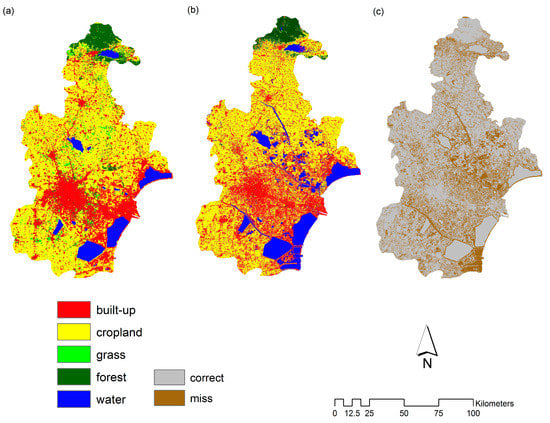 Actual map in 2015 (a), simulation map in 2015 (b), and error map (c).