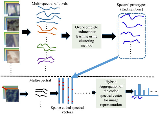 Much work has been devoted to concentrating the endmember determination, which is usually considered as a simplex identification problem [36,37,38,39]. However, the unmixing procedure is investigated in an image-wise approach, and the endmember and the abundance have been optimized independently for different images, which leads to completely different endmembers for different images. Furthermore, only a sub-complete set of the simplex (the number of simplexes are fewer than the number of spectral bands) can be obtained in the optimization. This study aims to learn a common set of bases (endmembers) for different sub-regions of satellite images, and an over-complete dictionary is preferred to take into consideration the variety of pixels in the same material and possible outliers in the target application. In the next section, we describe our proposed strategy in detail.