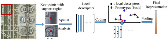 Considerable research efforts are being devoted to understanding satellite images. Among the approaches researchers have developed, the bag-of-visual-words (BOW) model [5,6,7] and its extensions have been widely applied to land-use scene classification. In general, this type of classification considers large-scale categories (with coverage of tens or hundreds of meters in one direction) such as airports, farmland, ports and parks. A flowchart of the BOW model is shown in Figure 2 and includes the following three main steps: (1) local descriptor extraction, which concentrates to explore the spatial relation of nearby pixel and ignores or separately analyzes the intensity variation of different colors (spectral bands) by using methods such as SIFT [16] and SURF [40]; (2) a coding procedure, which approximates a local feature using a linear combination of pre-defined or learned bases (codebook), and transforms each local feature into a more discriminated coefficient vector; (3) a pooling step, which aggregate all of the coded coefficient vectors in the region of interest into the final representation of this region via a max or average pooling strategy. The local descriptor in the BOW model for most applications usually remains untouched as SIFT and SURF, of which the design is handcrafted for exploring the local distinctive structure of the target objects. The local descriptor, which is most generally used, namely SIFT, needs to roughly and uniformly quantize the gradient direction between the nearby pixels into several orientation bins; however, this would cause the loss of some subtle structures and affect the final image representation ability. Therefore, some researchers investigated the local feature extraction procedure by automatically learning from a large number of unlabeled images with unsupervised learning techniques instead of using the handcrafted local feature extraction [20,21,22] and improved the classification performance to some extent. However, all of the above-mentioned algorithms mainly concentrate on spatial analysis to explore the distinctive local structure of general objects and take less consideration of the color (spectra) information, an approach that would be unsuitable for satellite scene classification as a result of its low spatial resolution. Recently, developments in deep convolutional networks have witnessed great success in different image classification applications, including applications involving the use of remote sensing images; however, these methods still focus on convoluting a spatial supported region into local feature maps. Because of the presence of multiple available spectral bands in satellite images, this study proposes to investigate the pixel spectral band and validate the feasibility and effectiveness for satellite scene classification.