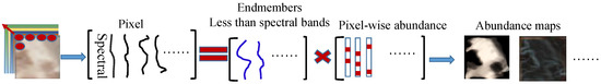 On the other hand, the existence of multiple spectral bands (also known as hyper-spectral data) in satellite images has promoted many researchers to propose pixel-wise land cover investigation to enable the variety of mixed pixels, known as an unmixing model [33,34,35], to be processed. The purpose of the unmixing model is to decompose the raw satellite images, composed of mixed pixels, into several material composition fraction maps and the corresponding set of pure spectral materials (also known as endmembers). The flowchart representing this procedure is shown in Figure 3. Given a multi-spectral satellite image with size (where B denotes the number of spectral bands and N and M denote the height and width of the satellite image, respectively), where the pixels may cover several types of land materials due to the low spatial resolution, we first re-arrange the image in the form of a matrix with a pixel-wise spectral column vector (size: ). The spectral vector of the i-th pixel is assumed to be a linear combination of several endmembers (basis) with the composition fraction as the weighted coefficients: , where is a set of spectral column vectors (K) representing the existing endmembers (land materials) in the processed satellite image. Considering the physical phenomenon of the spectral image, the elements in the endmember spectra and the fraction magnitude of the pixel abundance are non-negative, and the abundance vector for each pixel is summed to one. Then, the matrix formula for all pixels in a satellite image of interest can be formed as follows: