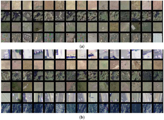 Some sample images. (a) Sample images from the SAT-4 dataset. Each row denotes a class of images, and from top to bottom, the classes are barren land, trees, grassland and others, respectively. (b) Sample images from the SAT-6 dataset. Each row denotes a class of images, and from top to bottom, the classes are buildings, barren land, trees, grassland, roads and water bodies, respectively.