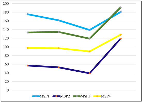 Plotted spectra of four learned multi-spectral prototypes (MSP) from the SAT-4 dataset, named MSP1, MSP2, MSP3, MSP4, respectively.