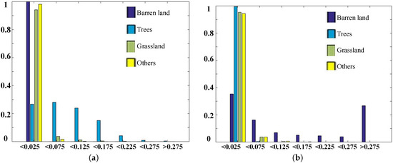 In our proposed strategy, we first need to learn the multi-spectral prototypes. In the implementation, we randomly select 1000 images from each class of the training dataset (SAT-4 and SAT-6, respectively) and generate the pixel-wise multi-spectral vectors from all of the selected images for learning the multi-spectral prototypes. Based on the introduced codebook learning approach, the K multi-spectral prototypes can be obtained. Figure 5 shows four multi-spectral prototypes of the learned codebook (32) using the SAT-4 dataset. Figure 6a–d indicates the image statistics of the coefficient weights corresponding to the considered prototypes (multi-spectral Prototype 1 (MSP1), MSP2, MSP3 and MSP4 from Figure 6a–d), where the horizontal and vertical axes denote the aggregated weight width of the four multi-spectral prototypes and image frequencies of each land use class in the defined weight regions, respectively. From Figure 6a, we can see that the second class (steel blue bar: trees) contains a greater number of images with large weights, whereas more than 90% of the images from the other three classes exhibit very small weights (less than 0.025). This means that the multi-spectral prototype, MSP1 in Figure 5, mainly represents the spectral data of trees material. Figure 6b confirms that the first class (midnight blue bar: barren land) contains more images with large weights, whereas more than 90% of the images from the other three classes manifest very small weights (less than 0.025). This means that the multi-spectral prototype, MSP2 in Figure 5, mainly represents the spectral data of barren land material. From Figure 6c,d, similarly as in Figure 6a,b, we can conclude that the multi-spectral prototypes MSP3 and MSP4 in Figure 5 mainly denote the spectral signature of grassland and other classes, respectively. Thus, the prototype vectors in the learned codebook would be accounted for in the multi-spectral signatures of the pure material in our target image dataset and would be effective for representing any multi-spectral vectors and display high discriminating ability for land use image classification.