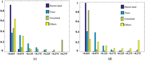 Image number statistics of the aggregated coefficients for different learned multi-spectral prototypes and the SAT-4 training dataset. (a) The image frequency of different land use classes between different aggregated coefficient regions of the MSP1 in Figure 5; (b) for the MSP2 in Figure 5; (c) for the MSP3 in Figure 5; (d) for the MSP4 in Figure 5.