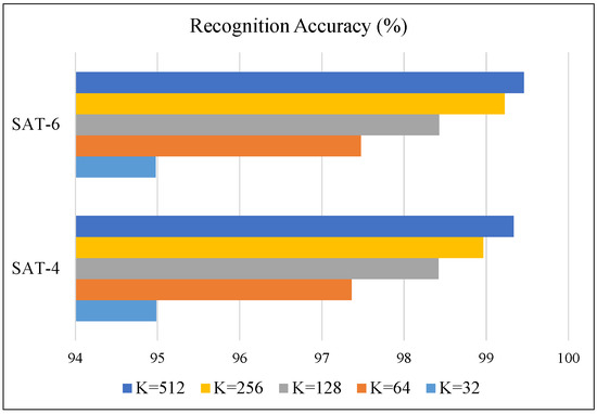 Recognition accuracies of the proposed multi-spectral representation based on the vector quantization (VQ) coding strategy under different codebook sizes (K = 32, 64, 128, 256, 512) for both datasets SAT-4 and SAT-6.