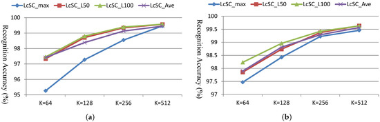 Recognition accuracies of the proposed multi-spectral representation based on LcSC coding and different pooling strategies (LcSC_Max: Max pooling; LcSC_Ave: average pooling; LcSC_L50: the proposed generalized pooling method with the top 50 coefficients; LcSC_L100: the proposed generalized pooling method with the top 100 coefficients) under codebook sizes (K = 64, 128, 256, 512) for both datasets: (a) SAT-4 and (b) SAT-6.