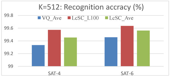 Compared recognition accuracies based on VQ and LcSC coding strategies for codebook size: K = 512 for both datasets SAT-4 and SAT-6.