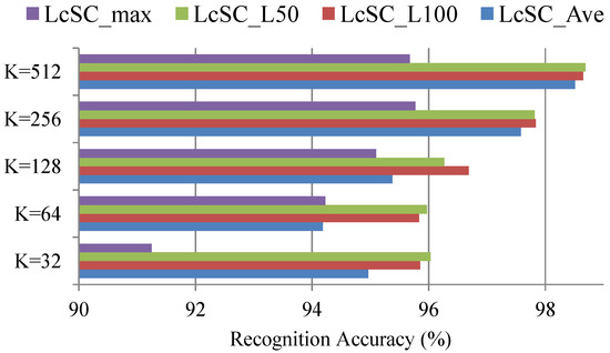 In the following, the recognition performance on the Megasolar dataset with seven spectral channels is provided. The experimental results using the LcSC coding approach with different pooling methods (average: LcSC_Ave, Max: LcSC_Max; and the proposed generalized method: LcSC_L50, LcSC_L100 with the top 50 and 100 largest weights) and different codebook sizes are given in Figure 10. Since the unbalance test sample numbers for positive and negative, the average recognition accuracy of the test positive and negative samples are computed, Figure 10 manifests that the proposed generalized pooling method can achieve a more accurate recognition performance than the conventional average- and max-pooling strategies under different codebook sizes.