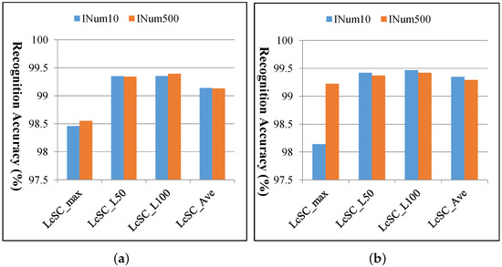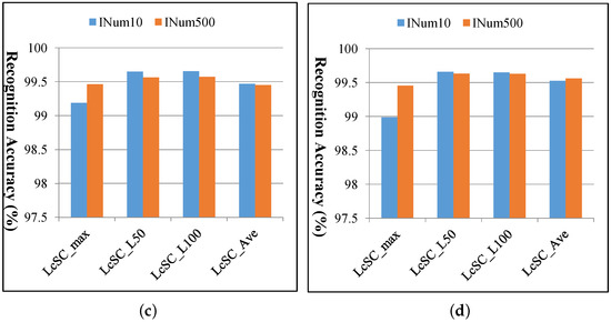 As the codebook learning for LcSC is an unsupervised procedure, it may not greatly affect the recognition performance with different numbers of images. We implemented the multi-spectral analysis strategy with the learned codebook using the randomly selected 10 images (denoted as INum10) only, instead of 500 images (denoted as INum500, in the previous experiments) from each class, and provide the compared results in Figure 11. From Figure 11, we can see that except the max-pooling-based LcSC feature, there are no obvious differences in recognition performances with the learned codebook using different image numbers, and thus, were can say that our proposed feature extraction strategy is robust to the codebook learning procedure. The processing times for codebook learning with 10 and 500 images from each class, respectively for both SAT-4 and SAT-6 datasets, are shown in Table 4, which manifests that the computational time can be greatly reduced for codebook learning with a small number of images.