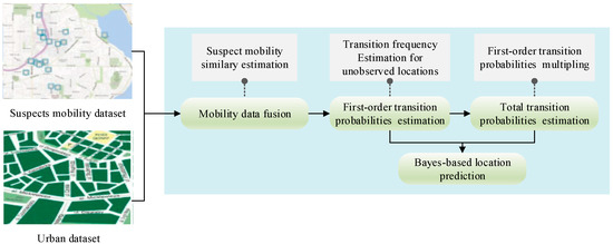 Benefiting from the rapid developments of positioning and monitoring technology, along with the extensive real-time collection of registering data in banks, restaurants, recreation venues, mobile telecoms and transportation sites [1], law enforcement has been endowed with the capability to monitor the location information of suspects’ social activities in recent years. These mobility data can be utilized to not only reveal suspects’ social and offending behavior preferences but also probe multiple crime incentives under different geographical environments. Furthermore, the ability to predict suspect location by mining spatiotemporal patterns from such mobility data can serve as a valuable source of knowledge for law enforcement from both tactical and strategic perspectives, such as assessing the correlation of suspects and crime locations, discovering gang members, and detecting “crime dark figures” [2,3].