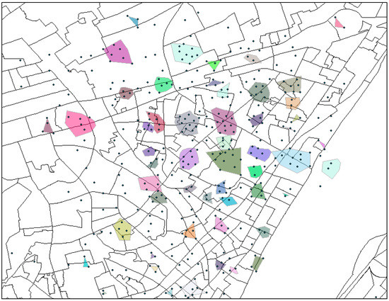 With Formula (5), all of the trajectory points are clustered into different regions using the DBSCAN [55] clustering algorithm. Figure 2 exhibits the regions in a local area, where each colored cluster and/or overlapping points (seen as a single point) denote a region.