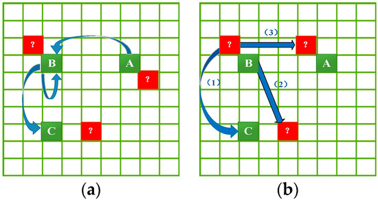 Fusing the trajectory data of similar suspects is an applicable way to alleviate the data sparsity problem. However, these trajectory data are usually insufficient since the visiting information among a number of unobserved locations is unknown. As a consequence, the prediction model will fail to unveil comprehensive mobility patterns among more locations, cause the model to suffer from the overfitting problem [53], and further make it incapable of meeting the prediction requirement when the query trajectory contains the unobserved locations. For example, as shown in Figure 3a, given that we already know the transition frequencies (blue arrows) among trajectory locations A, B and C (green grids), we can make a prediction for the query trajectory consisting of any of them. However, we are unable to make a prediction for any query trajectory consisting of the unobserved (peripheral) location (red grids with “?”) because there is no transition information for these locations in the mobility dataset.
