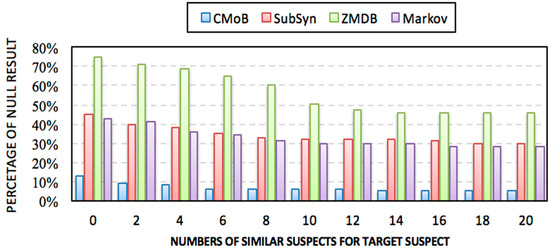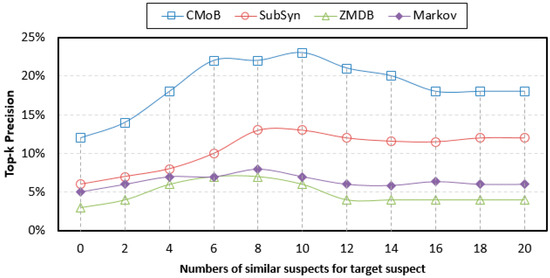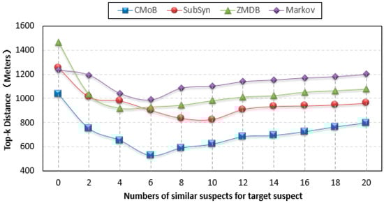 Experiments using real datasets showed that the proposed CMoB has outstanding predictive power compared with other methods on the metrics of top-k error, top-k precision, and missing percentiles, confirming that the proposed model is better and applicable to suspect location prediction. The declining effectiveness of the baseline methods relies mainly on two aspects. First, the sparsity of mobile data seriously undermines their robustness such that they cannot generalize to predict locations in unobserved areas. Most of the time, they can only consider the last point in the query trajectory as a single prediction result. Although SubSyn employs the trajectory data from more suspects and has better robustness compared with ZMDB and Markov, the incorporation of mobility data of un-similar suspects makes the transition patterns largely deviate from those of the target suspect, which has a negative effect on the precision of SubSyn. In comparison, our CMoB effectively lowers the negative impact caused by the sparsity of data by forcing the combination of the trajectory data of similar suspects as data sources and revealing the transition frequencies for unobserved locations based on the spatiotemporal semantics. Such efforts help reveal the comprehensive transition patterns of the target suspect and thus maintain a stable performance to advance its effectiveness by obtaining more predicted candidate locations close to the correct destinations.