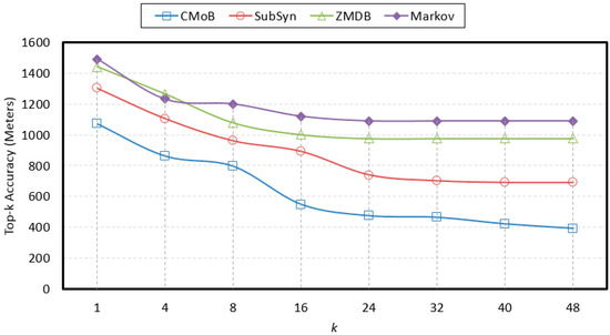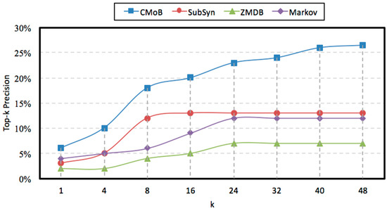 With the rise of k, the variations of prediction performances on TE and TP are shown in Figure 14 and Figure 15 when m = 20. It can be observed that the performances of CMoB are much better than the other 3 baseline methods at any k value. Meanwhile, as k reaches a critical value, the performances of SubSyn, ZMDB and Markov on TP and TE no longer changed. For example, when k > 24, the TE of ZMDB and Markov stopped at 976 m and 1091 m, respectively. Similarly, when k > 24, the TP of Markov and SubSyn no longer change, staying at 14% and 12%, respectively. However, with the increase of k, the performances of CMoB continued improving, where its TE falls down from 1072 m to 392 m and TP increases from 6% to 27%. Moreover, the improvement rates of CMoB on the two metrics are still the largest among these four models. This is because CMoB can obtain the transition patterns for more locations so there were more candidate predicted locations in its results. With the growth of k, the opportunities for observing shorter distances between the correct destination and the top-k candidate locations increase, and the correct destination is more likely to be found in the top-k candidate results. However, for the other three baseline methods, the numbers of candidate predicted locations in their results are very small or even equal to zero due to the data sparsity. Consequently, once k is beyond a critical value, there is no other candidate predicted location left to improve their performances on TP and TE.