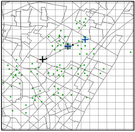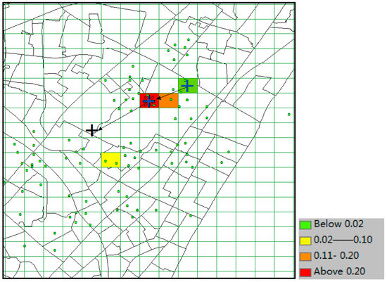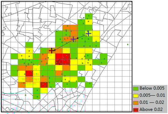 The predicted result of CMoB is shown in Figure 16, where the little green dots represent the visiting venues of the target suspect and his/her similar suspects (some dots overlap with each other), the query trajectory is composed of blue “+” and black arrows, and the colored grid denotes the predicted locations with the probabilities in decreasing order according to red-orange-yellow-green. The symbol “*” denotes the predicted location with highest probability, and the correct destination is represented as the black “+”, which is included in the predicted result set as the 8th highest probability. In this experiment, when k ≥ 8, this can be considered as a correct time with its TE = 0 m. From the plot, we can discover that the correct destination was an unobserved location that is never visited by the suspects, though it was still selected among the candidate predicted locations due to the outstanding ability of our model to learn transition frequencies of unobserved locations from sparse mobility data.